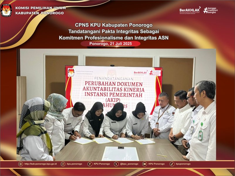 Ponorogo, 07 Juli 2025 — #TemanPemilih, Dalam rangka meneguhkan komitmen terhadap nilai-nilai integritas, profesionalisme, dan tanggung jawab sebagai Aparatur Sipil Negara, Calon Pegawai Negeri Sipil (CPNS) di lingkungan Komisi Pemilihan Umum (KPU) Kabupaten Ponorogo secara resmi menandatangani Pakta Integritas pada Senin (7/7).