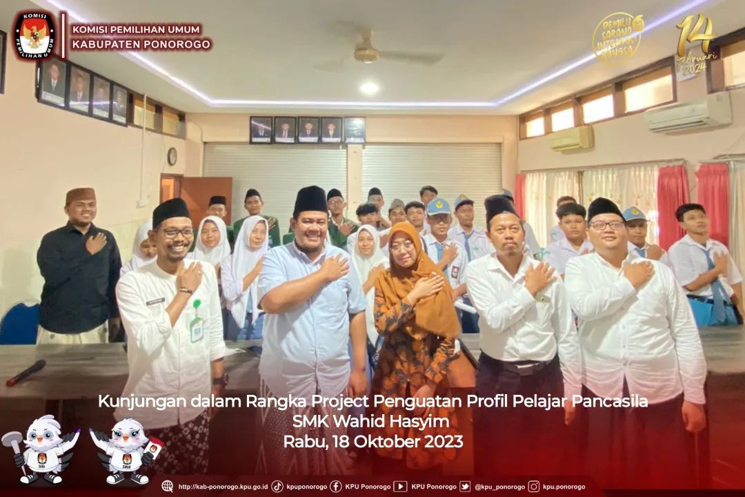 Ponorogo –kab.ponorogo.kpu.go.id- Sosialisasi pemilu selalu di lakasanakan Komisi Pemilihan Umum Kabupaten Ponorogo. Kali ini dilakukan dalam rangka kunjungan dari siswa Sekolah Menengah Kejuruan Wahid Hasyim Ponorogo bertempat di Kantor KPU Kabupaten Ponorogo Jl. Soekarno Hatta 40, pada rabu 18 Oktober 2023.