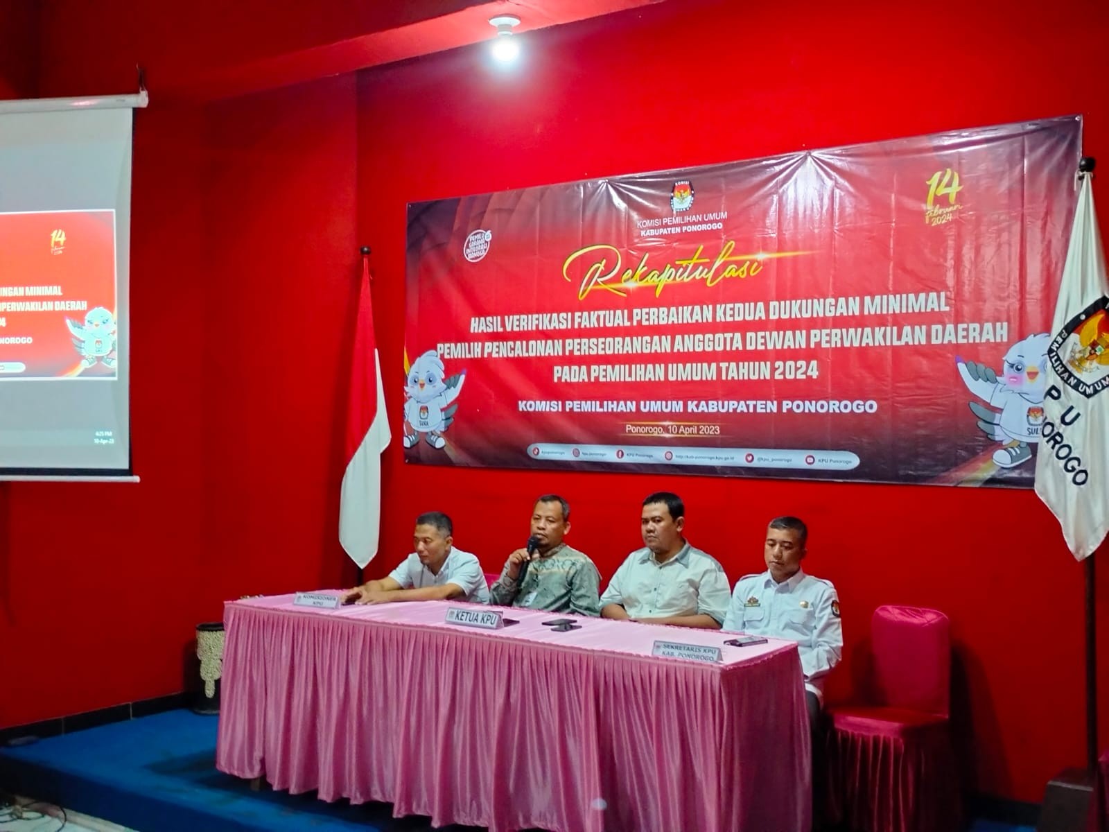 Ponorogo –kab.ponorogo.kpu.go.id- Komisi Pemilihan Umum Kabupaten Ponorogo lakukan Rekapitulasi Hasil Verifikasi Faktual Perbaikan Kedua Dukungan Minimal Pemilih Pencalonan Perseorangan Anggota Dewan Perwakilan Daerah Pada Pemilihan Umum Tahun 2024 pada senin 11 April 2022 pukul 14.00 wib di Hall Hotel Gajah Mada lantai II Jl. Gajah Mada No. 56 Ponorogo.