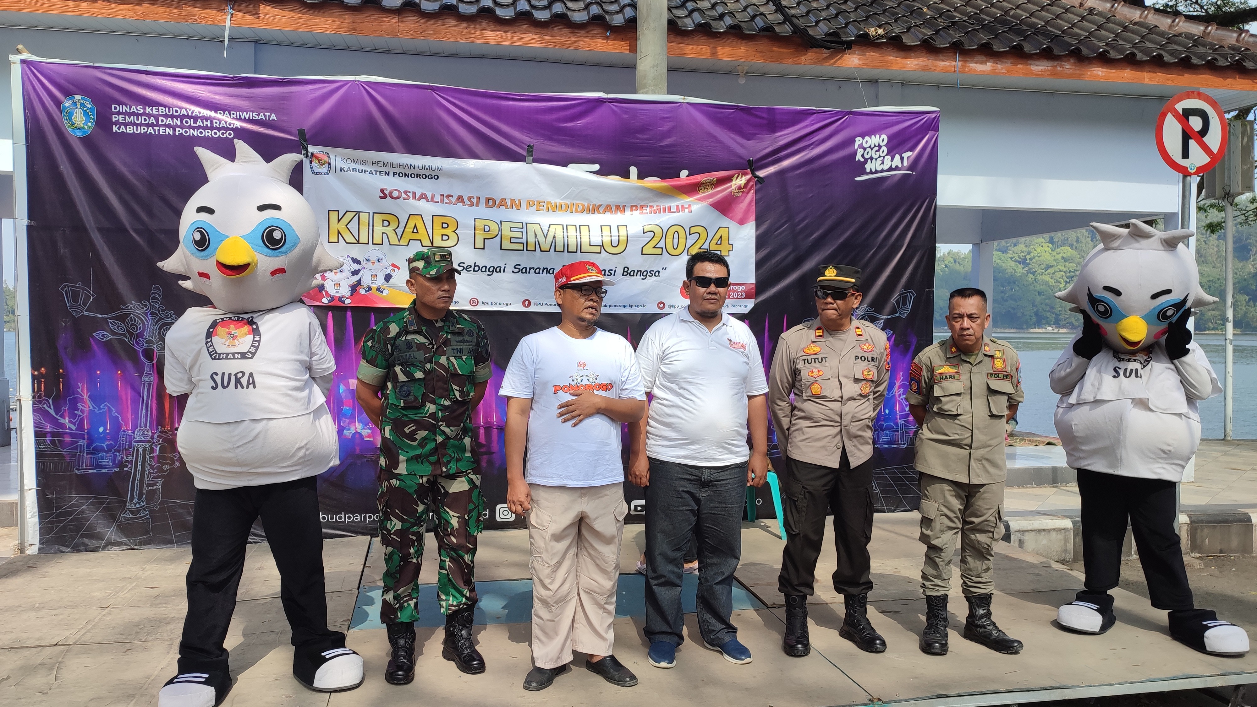 PONOROGO- kab-ponorogo.kpu.go.id- Kirab Bendera Pemilu 2024 hari ke empat dilanjutkan di hari Sabtu tanggal 15 Juli 2023 dengan rute arah Jenangan dan Ngebel untuk melakukan grebeg pasar dan Sosialisasi pendidikan pemilih serta membagi-bagikan souvenir, kalender maupun pamflet-pamflet kepada masyarakat. Hal yang menarik dari hari ini karena kirab dilakukan di destinasi wisata Telaga Ngebel sehingga banyak orang yang mengikuti sosialisasi. Seperti kirab sebelumnya rombongan tim kirab ini diikuti oleh Ketua dan anggota KPU Kabupaten Ponorogo juga Sekretaris KPU Kabupaten Ponorogo beserta jajarannya.