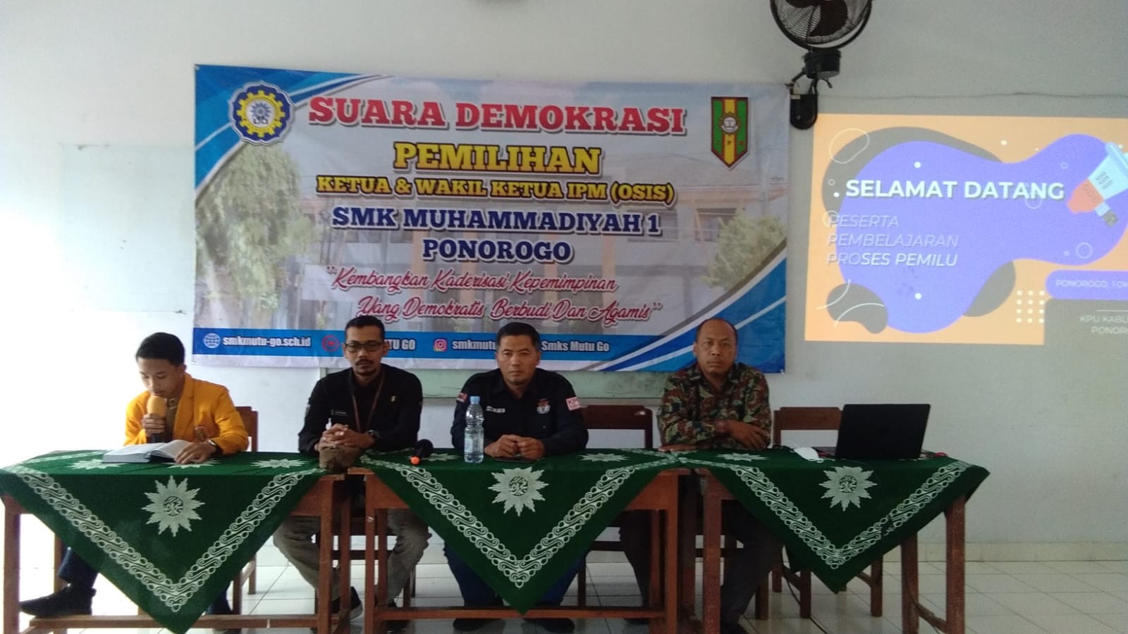 Kepala sekolah SMK Muhammadiyah 1 Nur Hamid dalam sambutan menyampaikan harapan besar dari kegiatan ini sebagai bentuk pendidikan kepemimpinan pada siswa, “kegiatan ini sengaja kita lakukan agar ke depan anak-anak bisa menjadi pemimpin yang baik. Kita sengaja mengambil narasumber langsung dari Komisi Pemilihan Umum Kabupaten Ponorogo agar anak-anak bisa menyerap ilmunya langsung dari sumbernya. KPU adalah penyelenggara pemilu yang terbiasa melaksanakan pemilihan dan di KPU terdapat strukturdi dalamnya, ada pimpinan lembaga KPU di daerah, dalam hal ini di Kabupaten Ponorogo.” jelasnya