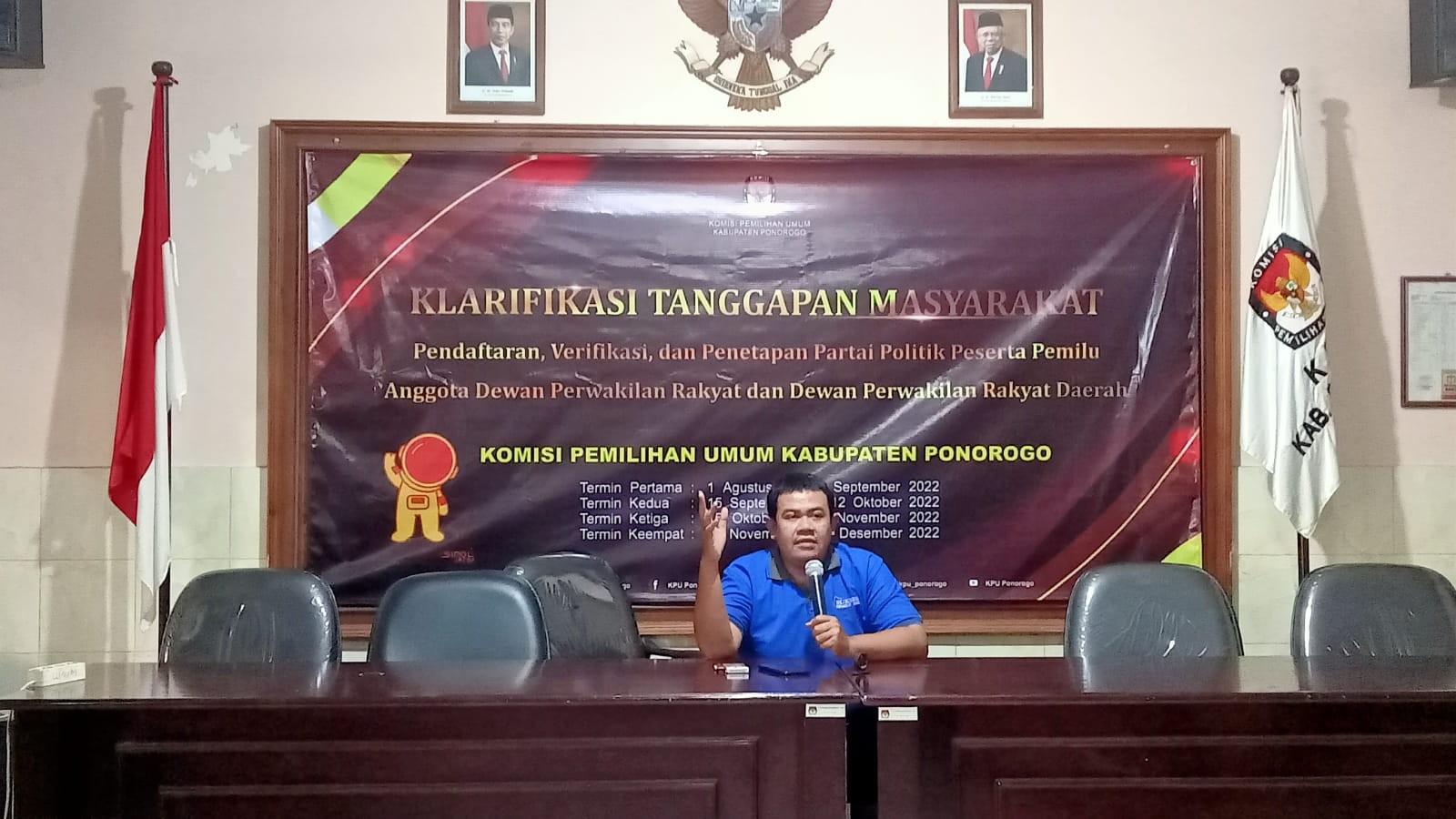PONOROGO – kab-ponorogo.kpu.go.id – Setelah klarifikasi tanggapan masyarakat termin pertama pada 14 September lalu, KPU Kabupaten Ponorogo melakukan klarifikasi tanggapan masyarakat pada periode termin kedua, Jumat (16/9) di Aula KPU Kabupaten Ponorogo. Termin kedua untuk melaksanakan klarifikasi tanggapan masyarakat yaitu pada 15 September sampai dengan 12 Oktober 2022.