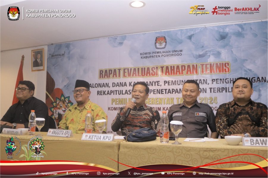 #Temanpemilih, Komisi Pemilihan Umum Kabupaten Ponorogo Mengelar Rapat Evaluasi Tahapan Teknis Pencalonan, Dana Kampanye, Pemungutan, Penghitungan, Rekapitulasi Dan Penetapan Calon Terpilih Dalam Pemelihan Serentak Tahun 2024 Pada Hari Senin, 29 April 2025. Kegiatan tersebut berlangsung di hotel Amaris pcc ponorogo, ketua KPU Ponorogo R.gaguk ika p menyampaikan kegiatan rapat evaluasi ini tentunya dapat menilai apa yang telah dilaksanakan selama tahapan, dengan aspek yang perlu diperbaiki maupun yang ditingkatkan. Gaguk juga menambahkan untuk dilaksanakannya pencatatan setiap evaluasi dan didokumentasikan dengan baik. Dalam hal ini hadir pula para narasumber dari akademisi yakni Wahyu Saputra, M.H.Li, Dr. Arik Dwijayamto, M.A, Dr. Robby Darwis Nasution, M.A.