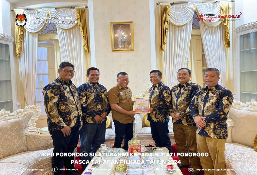 #Temanpemilih, Ketua KPU dan Anggota KPU Kabupaten Ponorogo beserta Sekretaris dan jajaran pejabat struktural melaksanakan agenda silaturahmi kepada Bupati Ponorogo H. Sugiri Sancoko. Ketua KPU Ponorogo R. Gaguk Ika Prayitna menyampaikan bahwa silaturahmi untuk mempererat hubungan antar kelembagaan dengan pemerintah daerah dan KPU Kabupaten Ponorogo. Ia menambahkan pentingnya menjaga komunikasi dan koordinasi antarlembaga untuk mewujudkan sigergitas yang berkelanjutan demi mendukung penyelenggaraan pesta demokrasi di masa-masa mendatang yang lebih baik di Kabupaten Ponorogo. Pelaksanaan Pilkada tahun 2024 sudah berlangsung kondusif, dan partisipasi masyarakat cukup tinggi. KPU Kabupaten Ponorogo Mengucapkan apresiasi yang setinggi-tingginya kepada seluruh stakeholder, khususnya Pemerintah Kabupaten Ponorogo, yang telah mendukung penuh pelaksanaan Pilkada Serentak Tahun 2024.