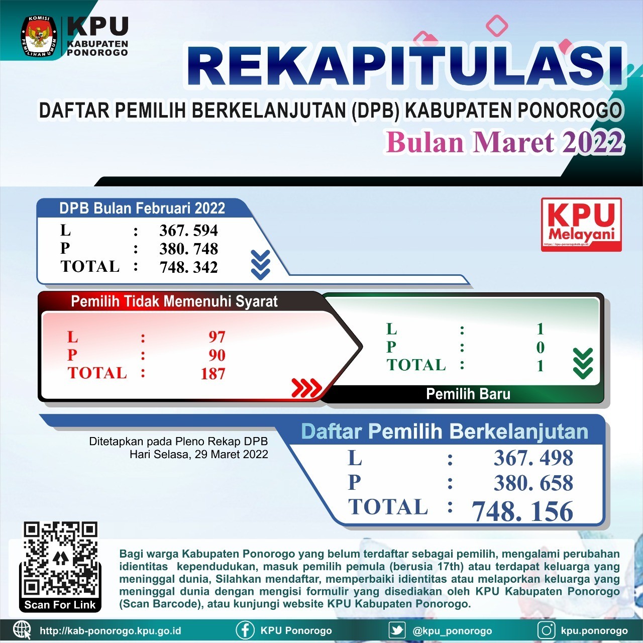 Hasil Rekapitulasi Daftar Pemilih Berkelanjutan Periode Maret Tahun 2022 dengan jumlah sebanyak 748.156 dengan rincian pemilih laki-laki 367.498 dan pemilih perempuan 380.658.