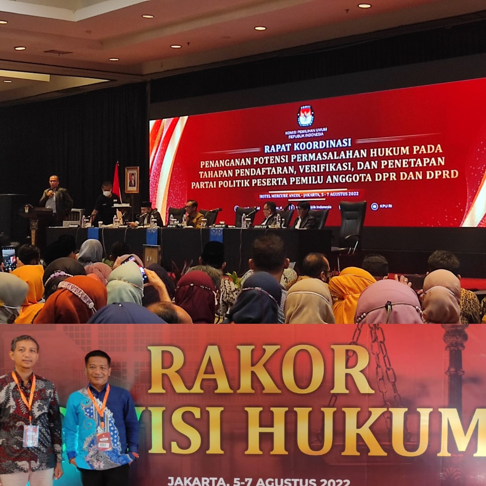 JAKARTA - kab-ponorogo.kpu.go.id - Divisi Hukum dan Pengawasan, R. Gaguk Ika Prayitna bersama Kasubbag Hukum KPU Kabupaten Ponorogo, Nanang Subekti menghadiri kegiatan Rapat Koordinasi Penanganan Potensi Hukum Permasalahan Hukum Tahapan Pendaftaran, Verifikasi, dan Penetapan Partai Politik Peserta Pemilihan Umum anggota DPR dan DPRD yang diselenggarakan di Jakarta pada 5-7 Agustus 2022.