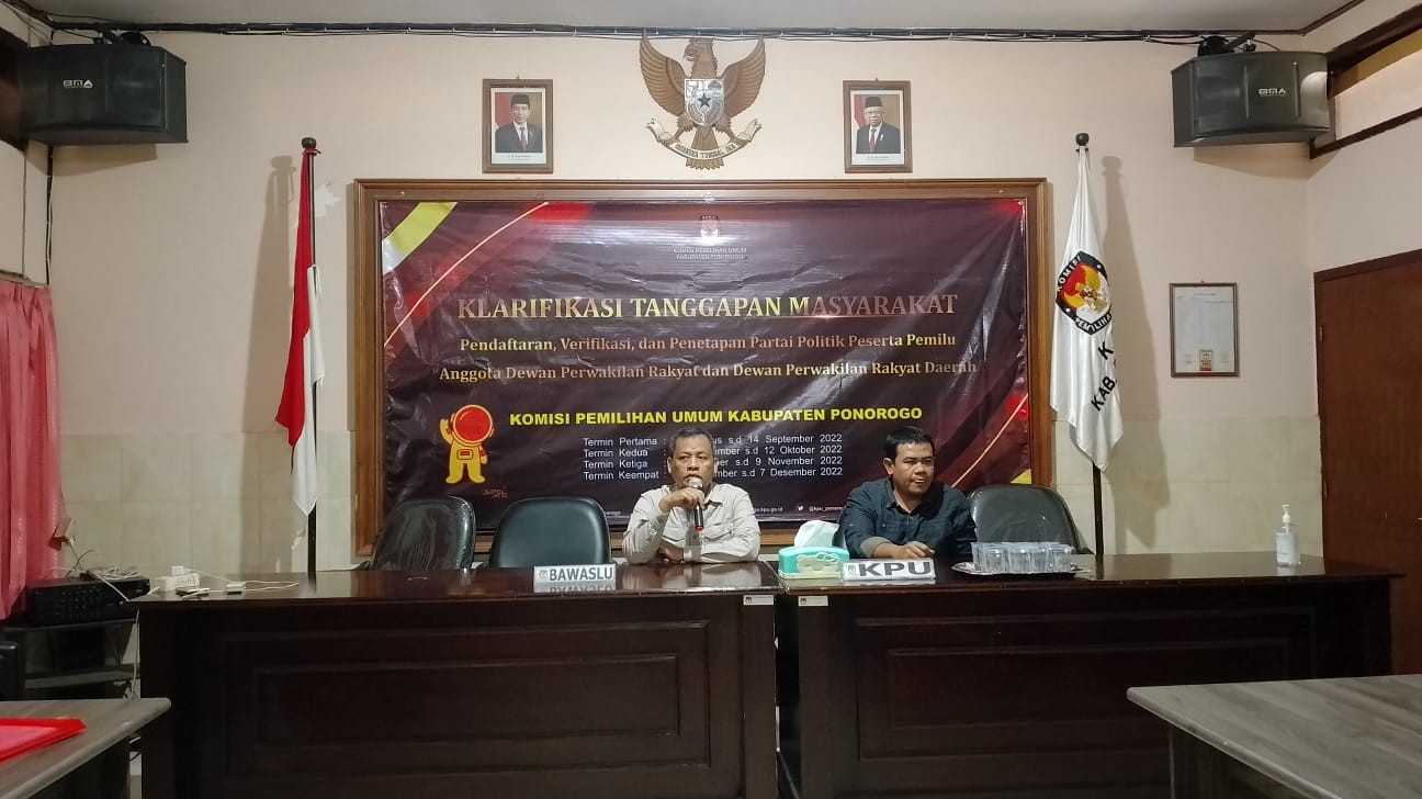 KPU Kabupaten Ponorogo sampai dengan termin pertama yaitu 1 Agustus – 14 September 2022 telah menerima 20 tanggapan masyarakat. Sebanyak 18 orang hadir dan 2 orang lainnya dinyatakan tidak hadir dalam proses klarifikasi tersebut.
