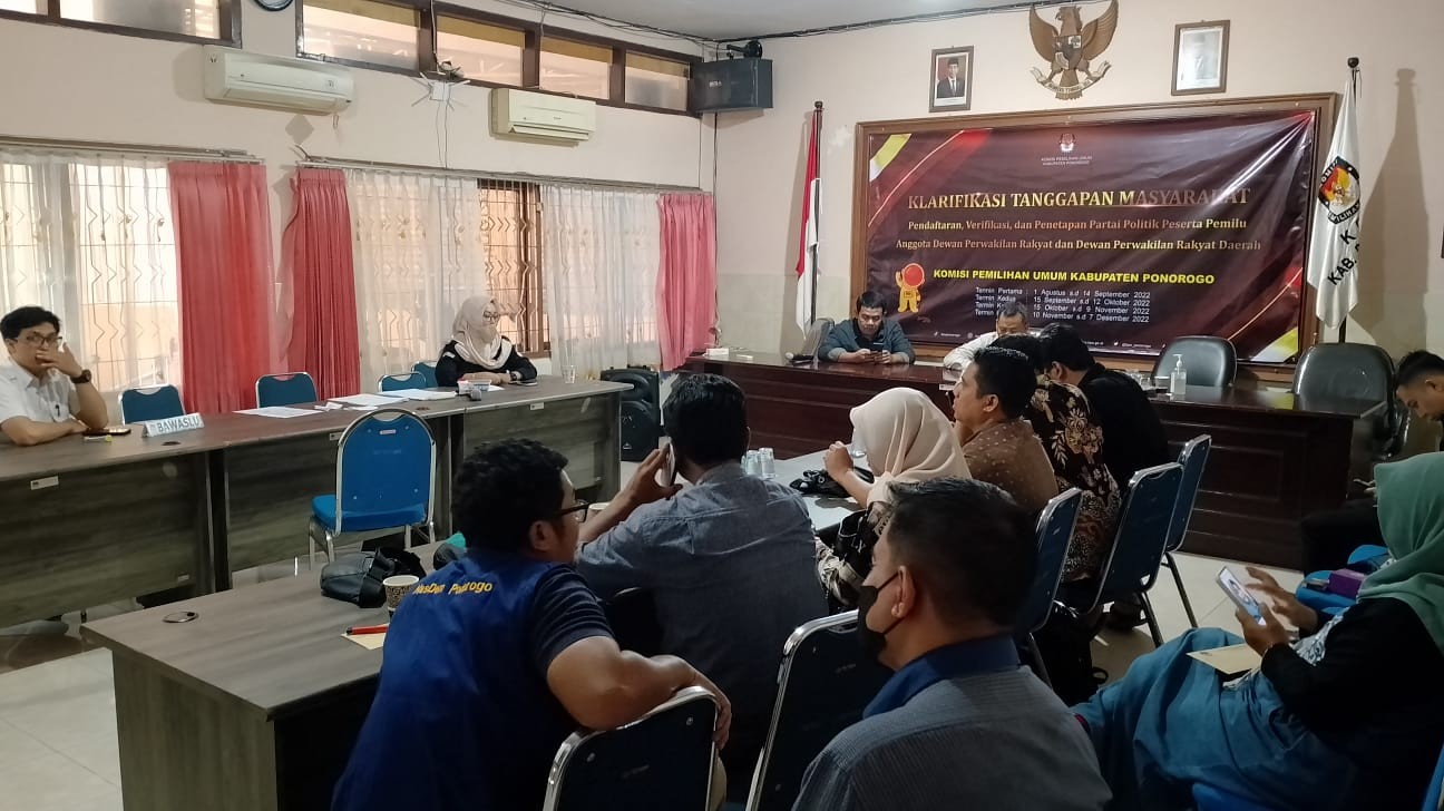 PONOROGO – kab-ponorogo.kpu.go.id – Berdasarkan Surat KPU Republik Indonesia Nomor 670/PL.01.1-SD/05/2022 tanggal 31 Agustus 2022 tentang Tanggapan Masyarakat, KPU Kabupaten Ponorogo melaksanakan klarifikasi termin pertama yang merupakan tindak lanjut terhadap tanggapan masyarakat yang disampaikan melalui helpdesk.kpu.go.id/tanggapan, Rabu (14/9) di Aula KPU Kabupaten Ponorogo.