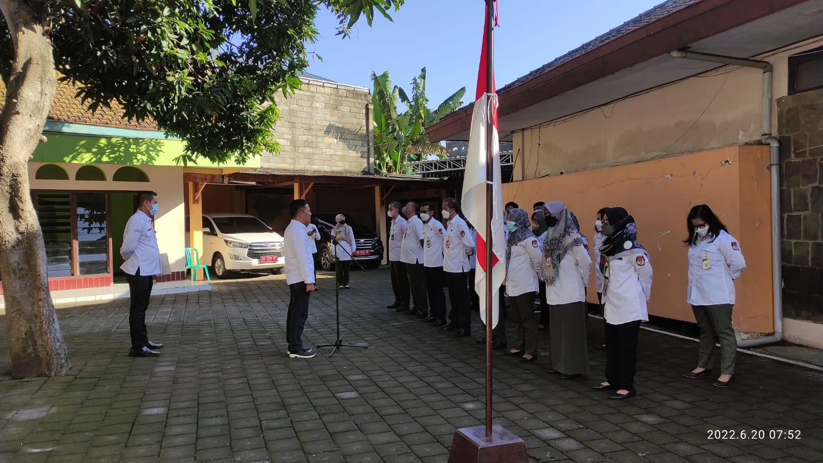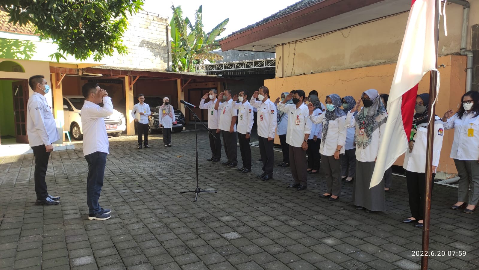 Apel pagi dilaksanakan pukul 07.30 WIB dan berakhir pukul 07.55 WIB dengan diikuti oleh semua staf sekretariat KPU Ponorogo. (d2g)