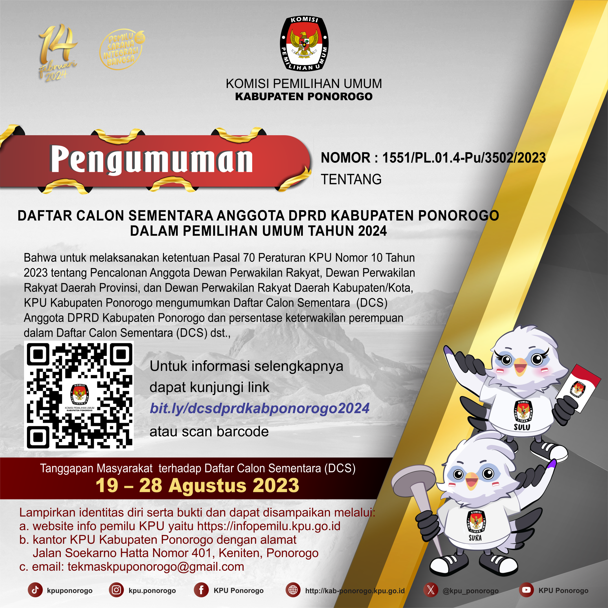 Bahwa untuk melaksanakan ketentuan Pasal 70 Peraturan KPU Nomor 10 Tahun 2023 tentang Pencalonan Anggota Dewan Perwakilan Rakyat, Dewan Perwakilan Rakyat Daerah Provinsi, dan Dewan Perwakilan Rakyat Daerah Kabupaten/Kota, KPU Kabupaten Ponorogo mengumumkan Daftar Calon Sementara (DCS) Anggota DPRD Kabupaten Ponorogo dan persentase keterwakilan perempuan dalam Daftar Calon Sementara (DCS) sebagaimana terlampir. selengkapnya…