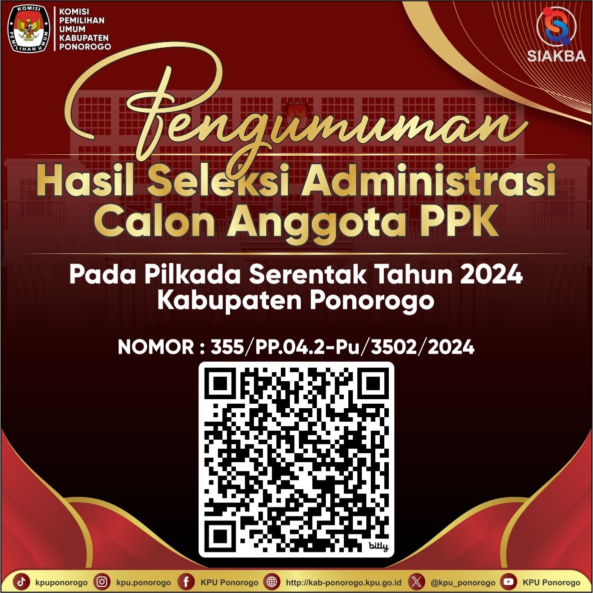 Sehubungan dengan Komisi Pemilihan Umum Kabupaten Ponorogo telah melaksanakan tahapan Penelitian Administrasi Calon Anggota Panitia Pemilihan Kecamatan pada untuk Pemilihan Gubernur dan Wakil Gubernur Jawa Timur serta Bupati dan Wakil Bupati Ponorogo Tahun 2024.