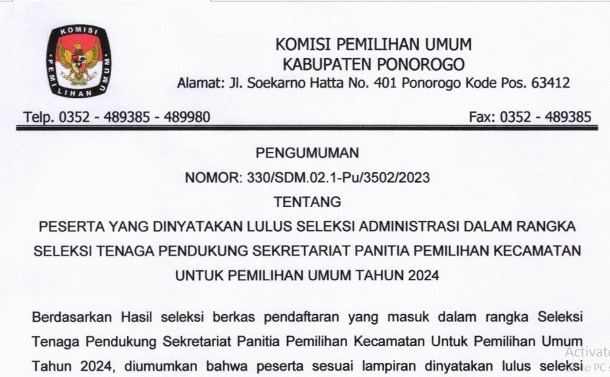 PENGUMUMAN HASIL SELEKSI ADMINISTRASI TENAGA PENDUKUNG SEKRETARIAT PANITIA PEMILIHAN KECAMATAN UNTUK PEMILIHAN UMUM TAHUN 2024