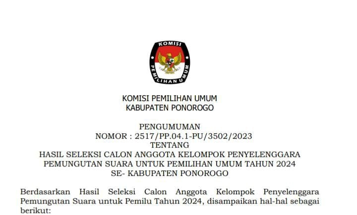 PENGUMUMAN HASIL SELEKSI CALON ANGGOTA KELOMPOK PENYELENGGARA PEMUNGUTAN SUARA UNTUK PEMILIHAN UMUM TAHUN 2024 SE- KABUPATEN PONOROGO