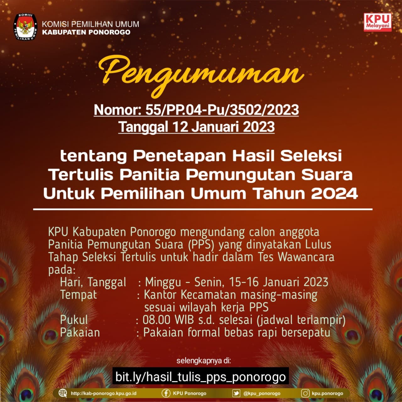 Berdasarkan Berita Acara Rapat Pleno KPU Kabupaten Ponorogo Nomor 12/PP.04-BA/3502/2023 tanggal 11 Januari 2023 tentang Hasil Seleksi Tertulis Panitia Pemungutan Suara untuk Pemilu Tahun 2024, disampaikan hal-hal sebagai berikut: