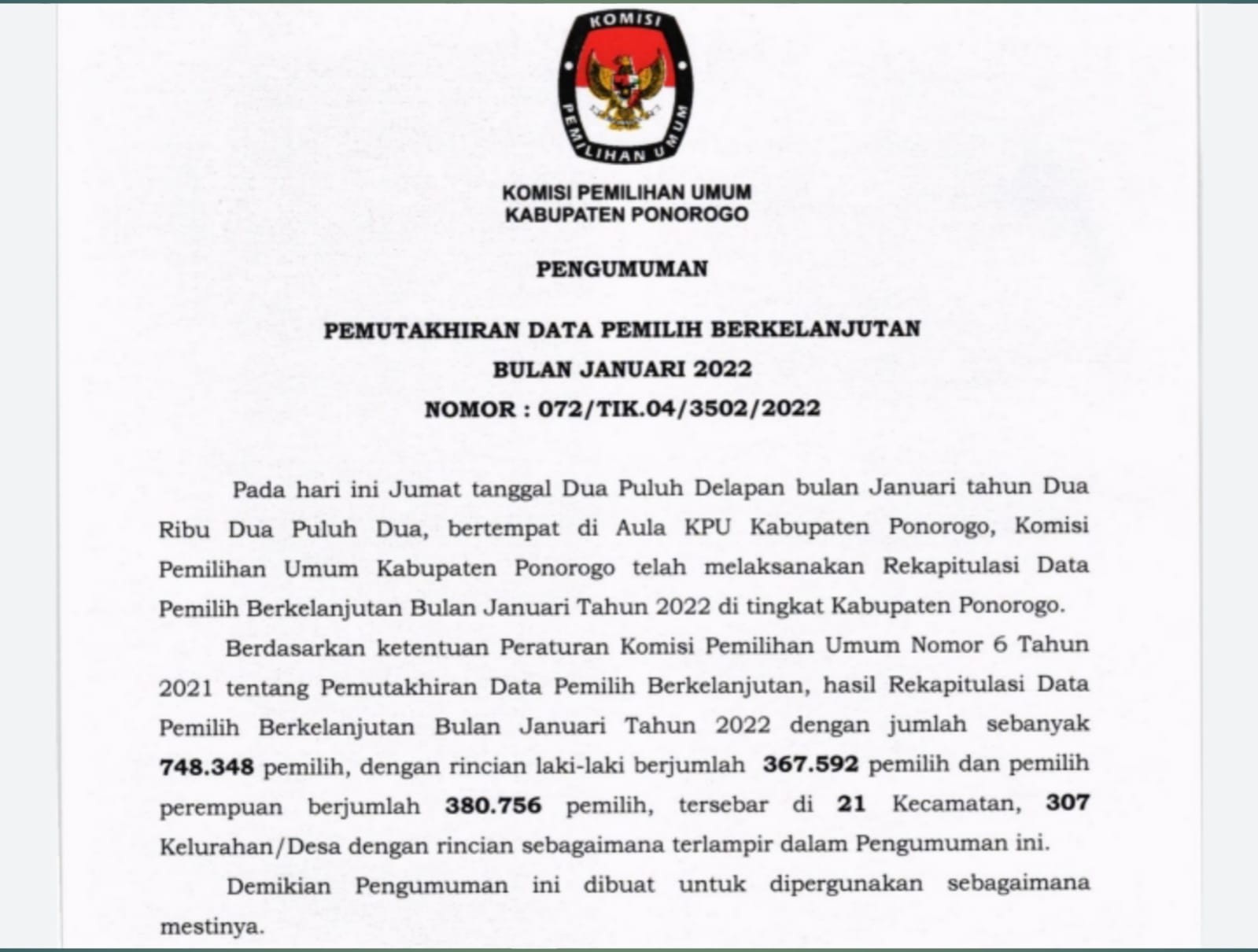 Berikut disampaikan Pengumuman Nomor : 072/TIK.04/3502/2022 Tentang Pemutakhiran Data Pemilih Berkelanjutan Bulan Januari 2022
