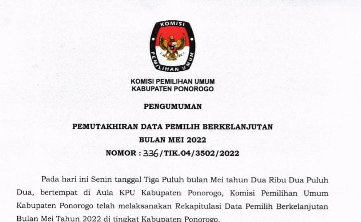 Berikut disampaikan Pengumuman Nomor: 336/TIK.04/3502/2022 Tentang Pemutakhiran Data Pemilih Berkelanjutan Bulan Mei 2022