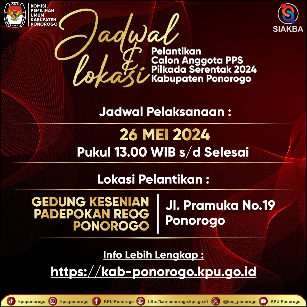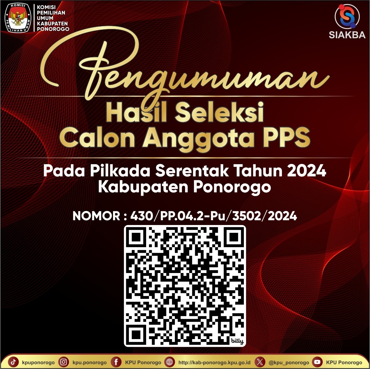 Sehubungan dengan Komisi Pemilihan Umum Kabupaten Ponorogo telah melaksanakan tahapan Wawancara dan menyelesaikan seluruh tahapan seleksi Calon Anggota Panitia Pemungutan Suara untuk Pemilihan Gubernur dan Wakil Gubernur Jawa Timur serta Bupati dan Wakil Bupati Ponorogo Tahun 2024, disampaikan beberapa hal sebagai berikut: