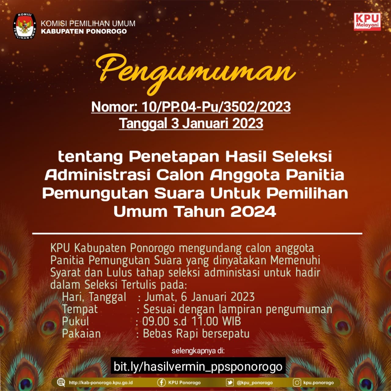 Berdasarkan Berita Acara Rapat Pleno KPU Kabupaten Ponorogo Nomor 1/PL.04-BA/3502/2023 tanggal 1 Januari 2023 tentang Rapat Pleno Penetapan Hasil Seleksi Administrasi Calon Anggota Panitia Pemungutan Suara untuk Pemilu Tahun 2024,