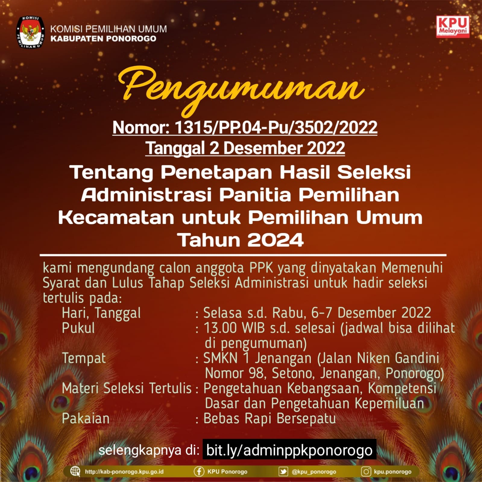 Berdasarkan Berita Acara Rapat Pleno KPU Kabupaten Ponorogo Nomor 259/PP.04-BA/3502/2022 tanggal 30 November 2022 tentang Rapat Pleno Hasil Seleksi Administrasi Panitia Pemilihan Kecamatan untuk Pemilu Tahun 2024, berikut kami lampirkan Pengumuman Penetapan Hasil Seleksi Administrasi Panitia Pemilihan Kecamatan untuk Pemilu Tahun 2024.