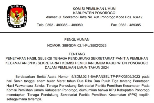 PENGUMUMAN PENETAPAN HASIL SELEKSI TENAGA PENDUKUNG SEKRETARIAT PANITIA PEMILIHAN KECAMATAN (PPK) SEKRETARIAT KOMISI PEMILIHAN UMUM KABUPATEN PONOROGO DALAM PEMILIHAN UMUM TAHUN 2024