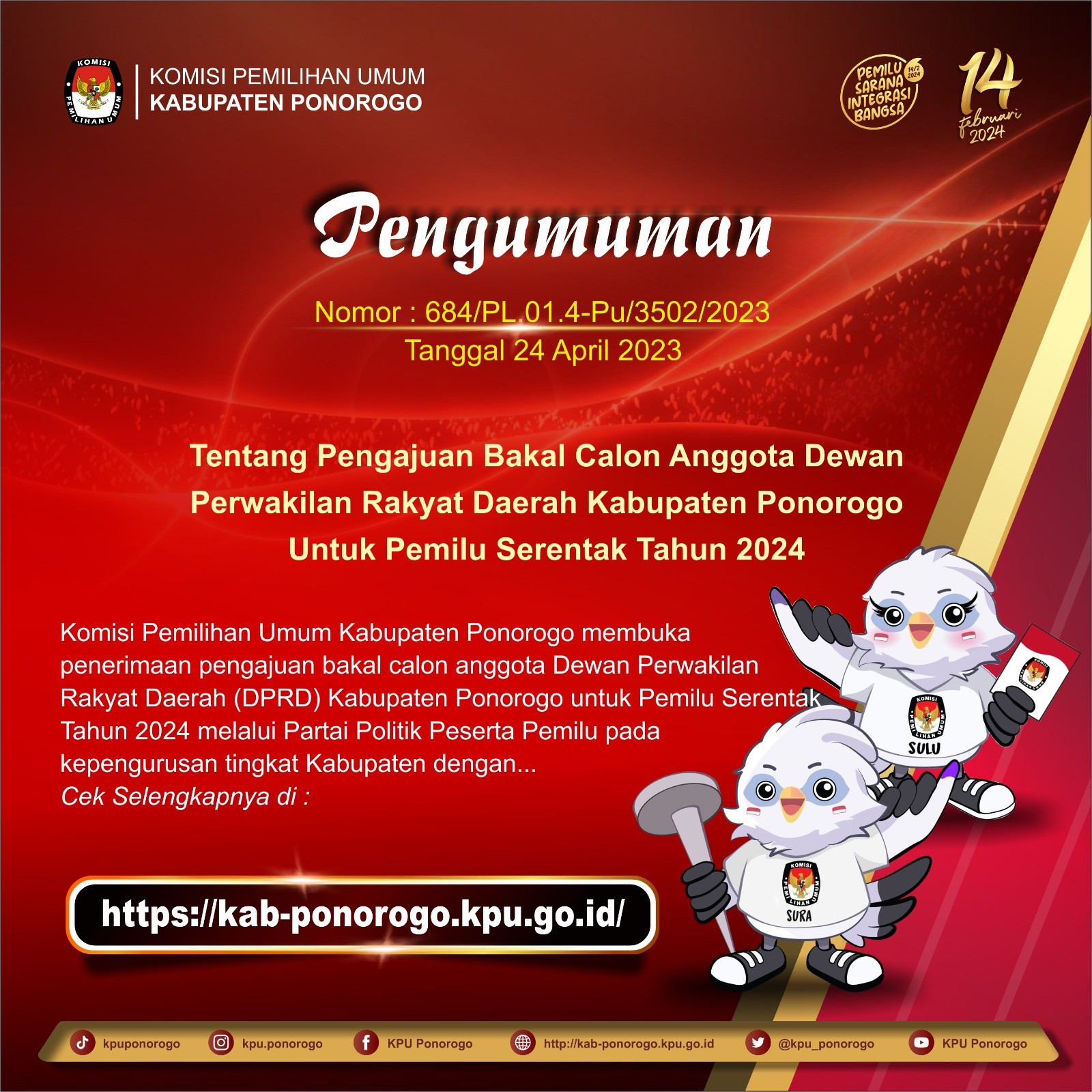 PENGUMUMAN PENGAJUAN BAKAL CALON ANGGOTA DPRD KABUPATEN PONOROGO UNTUK PEMILU SERENTAK TAHUN 2024