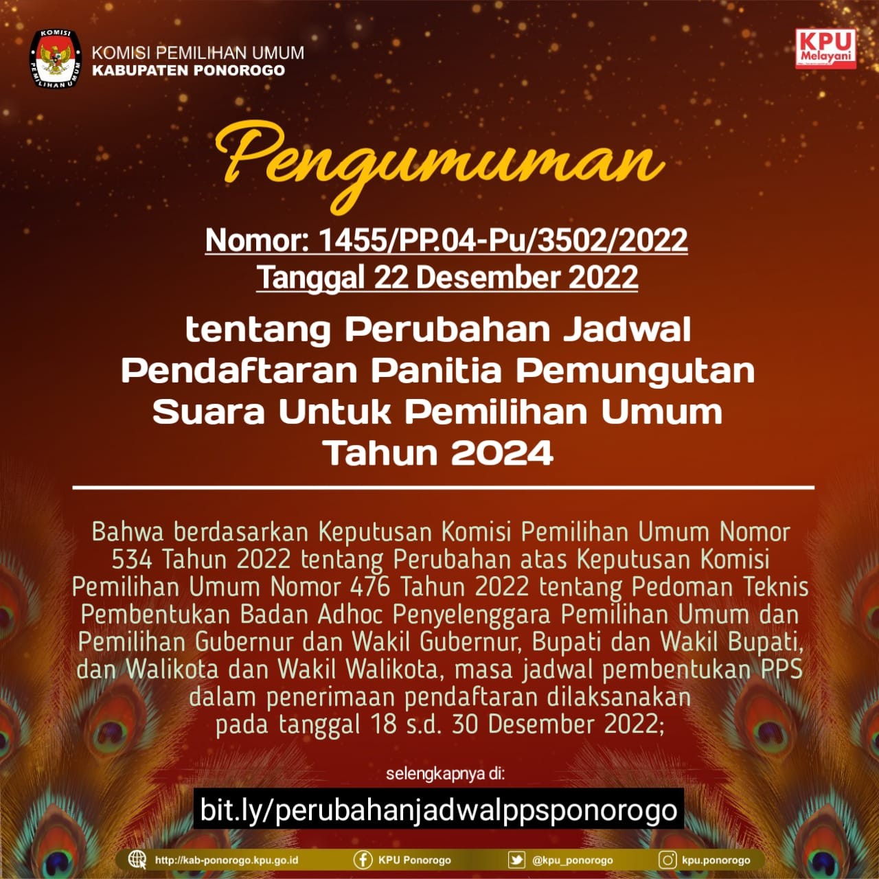 PENGUMUMAN PERUBAHAN JADWAL PENDAFTARAN PANITIA PEMUNGUTAN SUARA (PPS) KABUPATEN PONOROGO