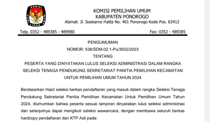 PENGUMUMAN PESERTA YANG DINYATAKAN LULUS SELEKSI ADMINISTRASI DALAM RANGKA SELEKSI TENAGA PENDUKUNG SEKRETARIAT PANITIA PEMILIHAN KECAMATAN UNTUK PEMILIHAN UMUM TAHUN 2024