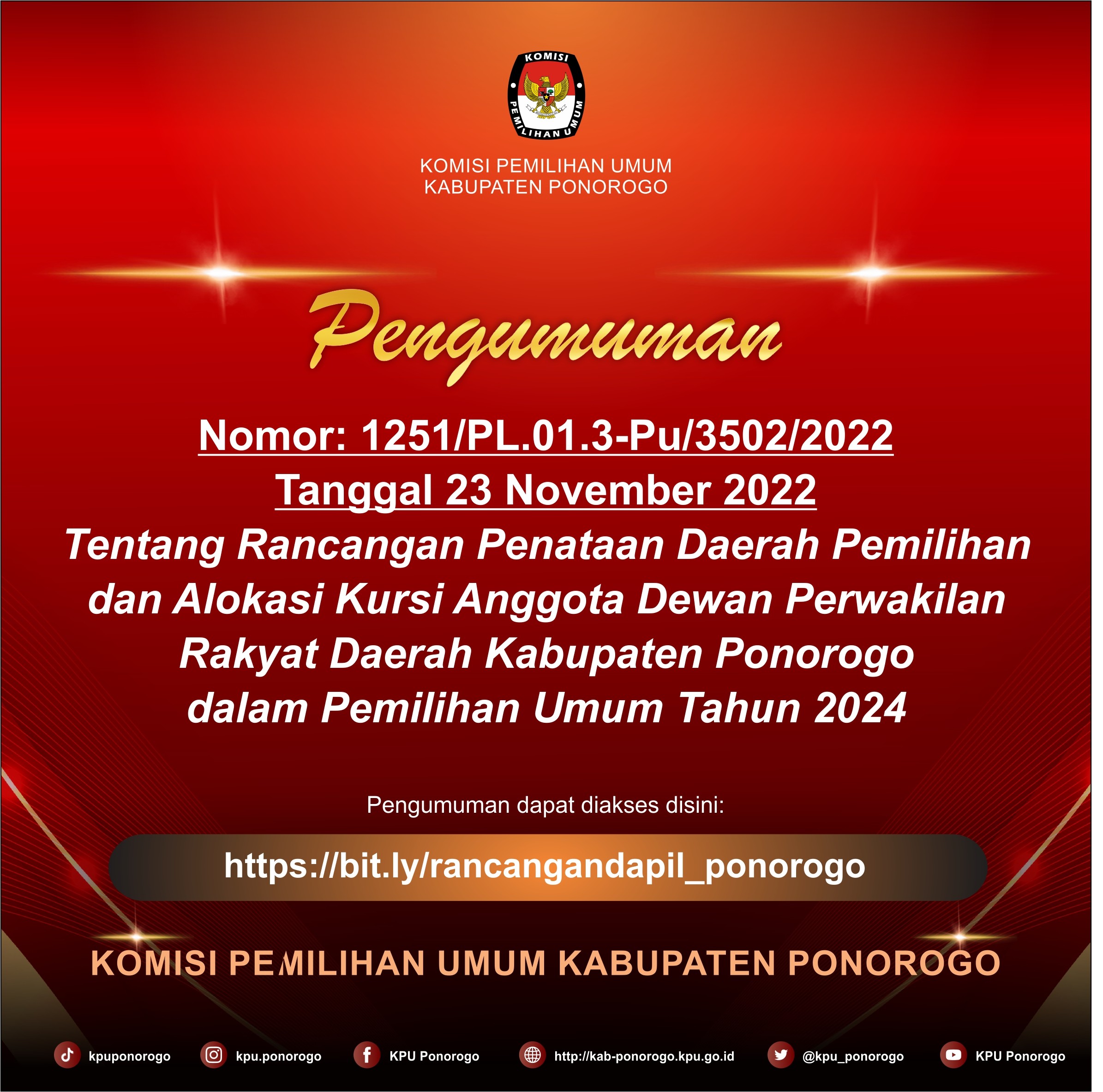 Pengumuman Rancangan Penataan Daerah Pemilihan dan Alokasi Kursi Anggota Dewan Perwakilan Rakyat Daerah Kabupaten Ponorogo dalam Pemilihan Umum Tahun 2024