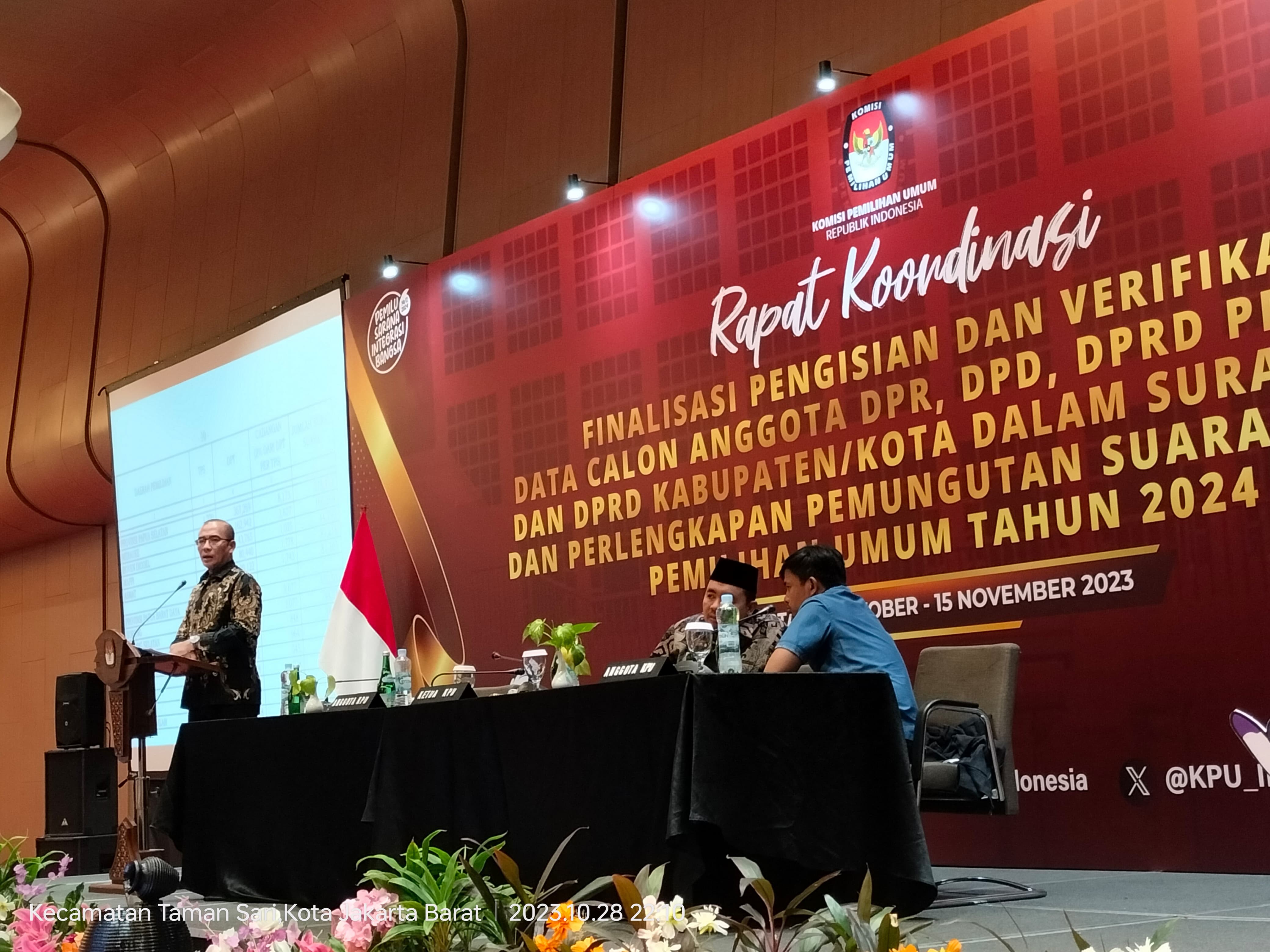 Rakor Finalisasi Pengisian dan Verifikasi Data Calon Anggota DPR, DPD, DPRD Provinsi, dan DPRD Kabupaten/Kota Pemilu Tahun 2024 dalam Surat Suara dan Perlengkapan Pemungutan Suara dibuka langsung oleh Ketua KPU RI Hasyim Asyari.