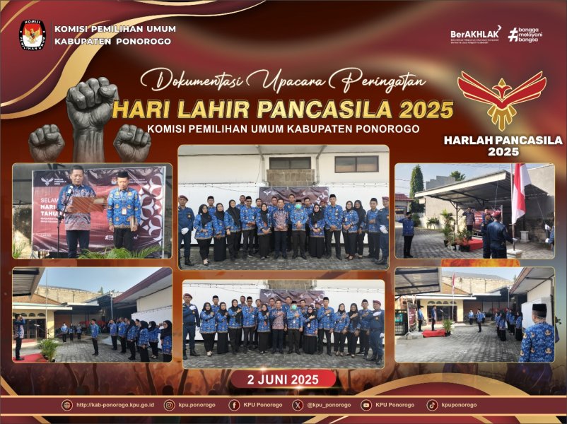 #TemanPemilih, Komisi Pemilihan Umum Kabupaten Ponorogo melaksanakan upacara Hari Lahir Pancasila Tahun 2025 di halaman kantor, Jl. Soekarno Hatta 401 Keniten Ponorogo (Senin, 2 Juni 2025).