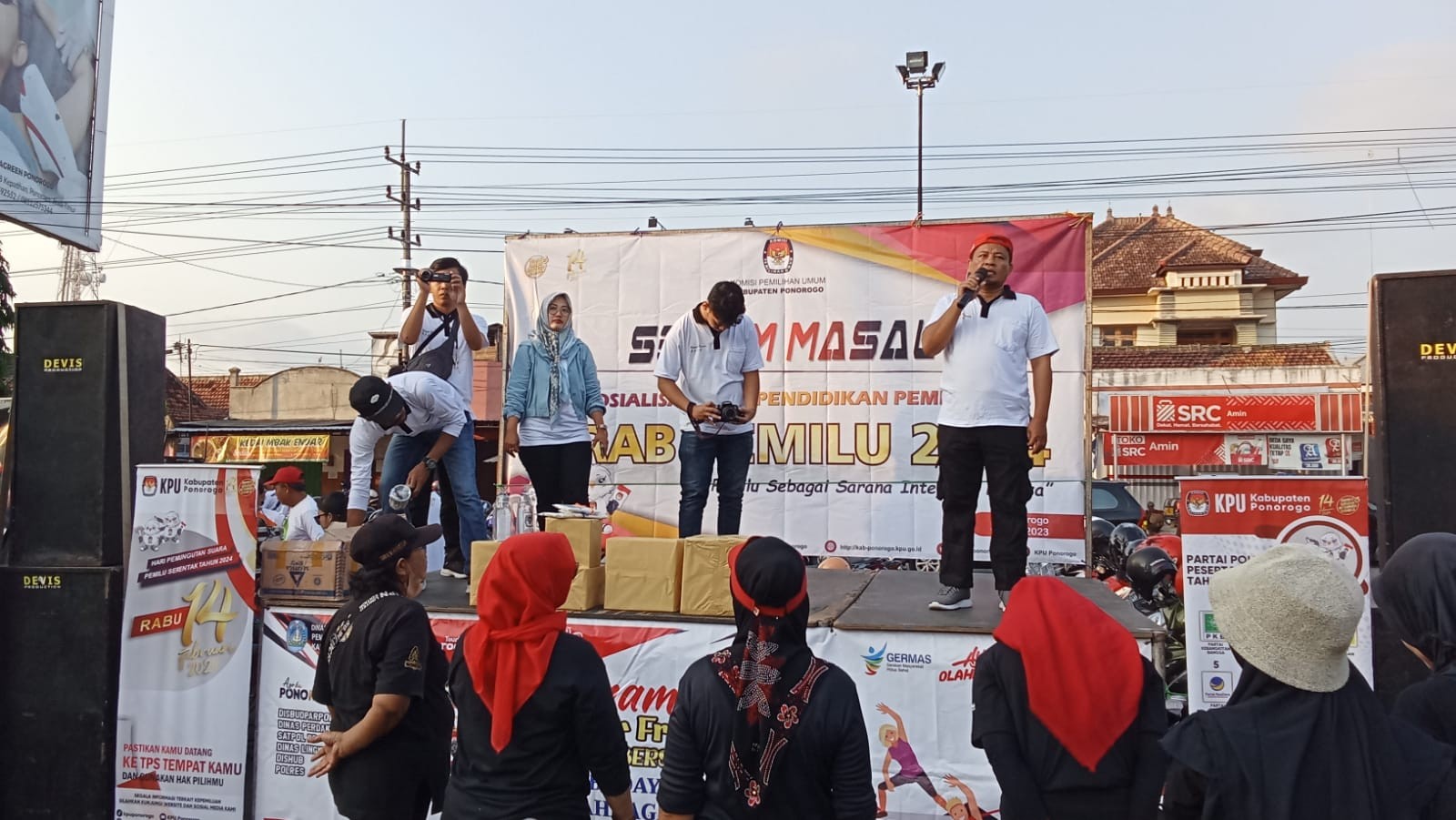 Pada kesempatan kali ini, tim kirab KPU Ponorogo bekerja sama dengan Dinas Pemuda dan Olahraga Kabupaten Ponorogo yang rutin melaksanakan kegiatan senam masal di Jalan Suromenggolo.