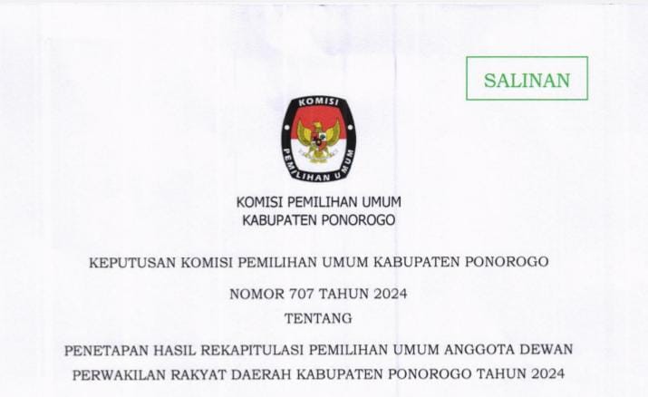SURAT KEPUTUSAN KPU KABUPATEN PONOROGO TENTANG PENETAPAN HASIL REKAPITULASI PEMILIHAN UMUM ANGGOTA DEWAN PERWAKILAN RAKYAT DAERAH KABUPATEN PONOROGO TAHUN 2024
