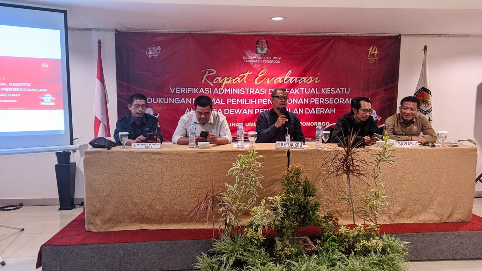 M. Arwan Hamidi Ketua Divisi Teknis dan Penyelenggra KPU Kabupaten Ponorogo memberikan arahan bahwasannya verifikasi sudah berjalan dengan baik dan sesuai aturan yang berlaku. “Verifikasi administrasi dan faktual untuk calon Anggota Dewan Perwakilan Rakyat Daerah kesatu telah kita lakukan dan alhamdulillah berjalan lancar. Kita ketahui bersama peserta pemilu ada partai Politik, perseorangan dan Pasanga Calon dan saat ini kita sedang melayani bakal calon perseorangan yang akan melakukan pemilihian DPD pada Pemilu 2024.”